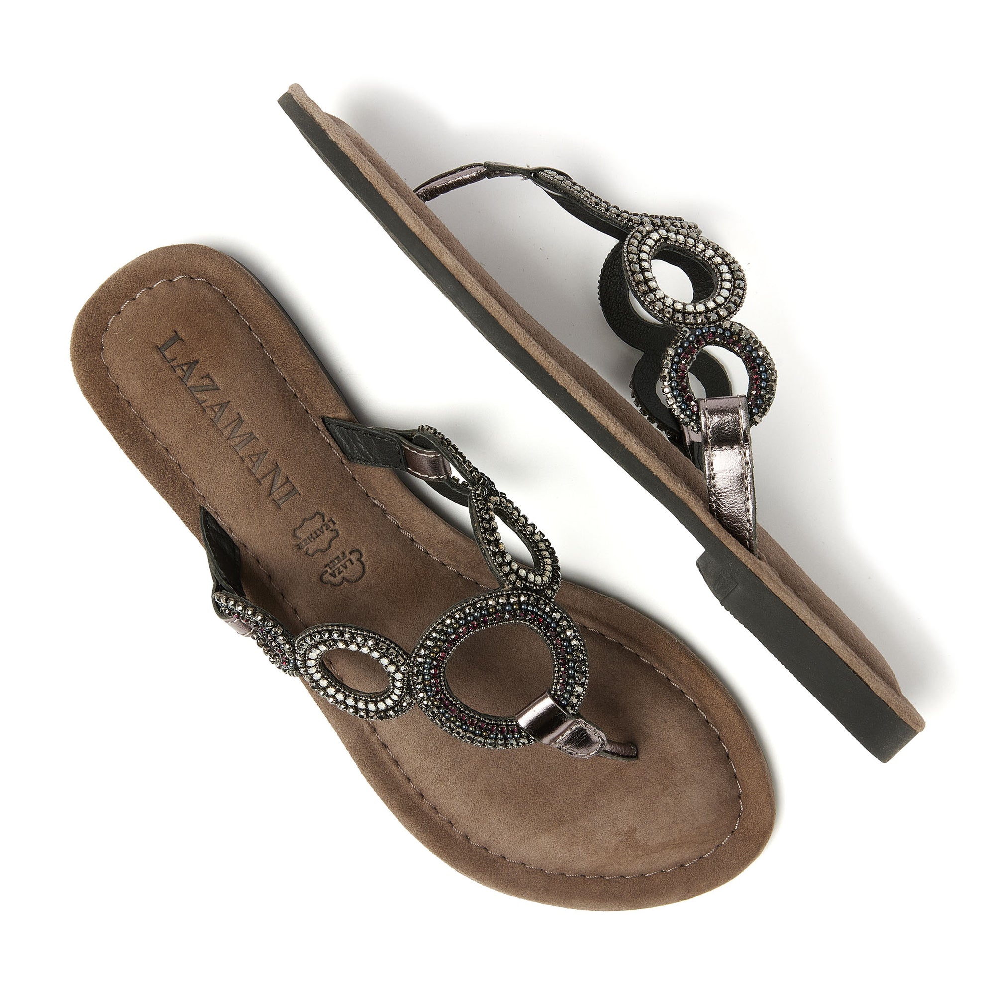 Diese bequemen Zehentrenner passen zu allem und sind daher ein Must-Have für Ihre Sommergarderobe. Das lederne Obermaterial besteht aus runden Formen, die mit verschiedenen Steinen in ruhigen Farbtönen verziert sind. Ein geschmackvolles Gesamtbild zusammen mit dem metallischen Finish des Leders und dem braunen Wildleder, das das weich gepolsterte Fußbett bedeckt. Dies sorgt dafür, dass die Pantoletten bequem sitzen. Die Laufsohle aus Gummi ist rutschfest, stabil und mit kleinem 1-cm-Absatz versehen.