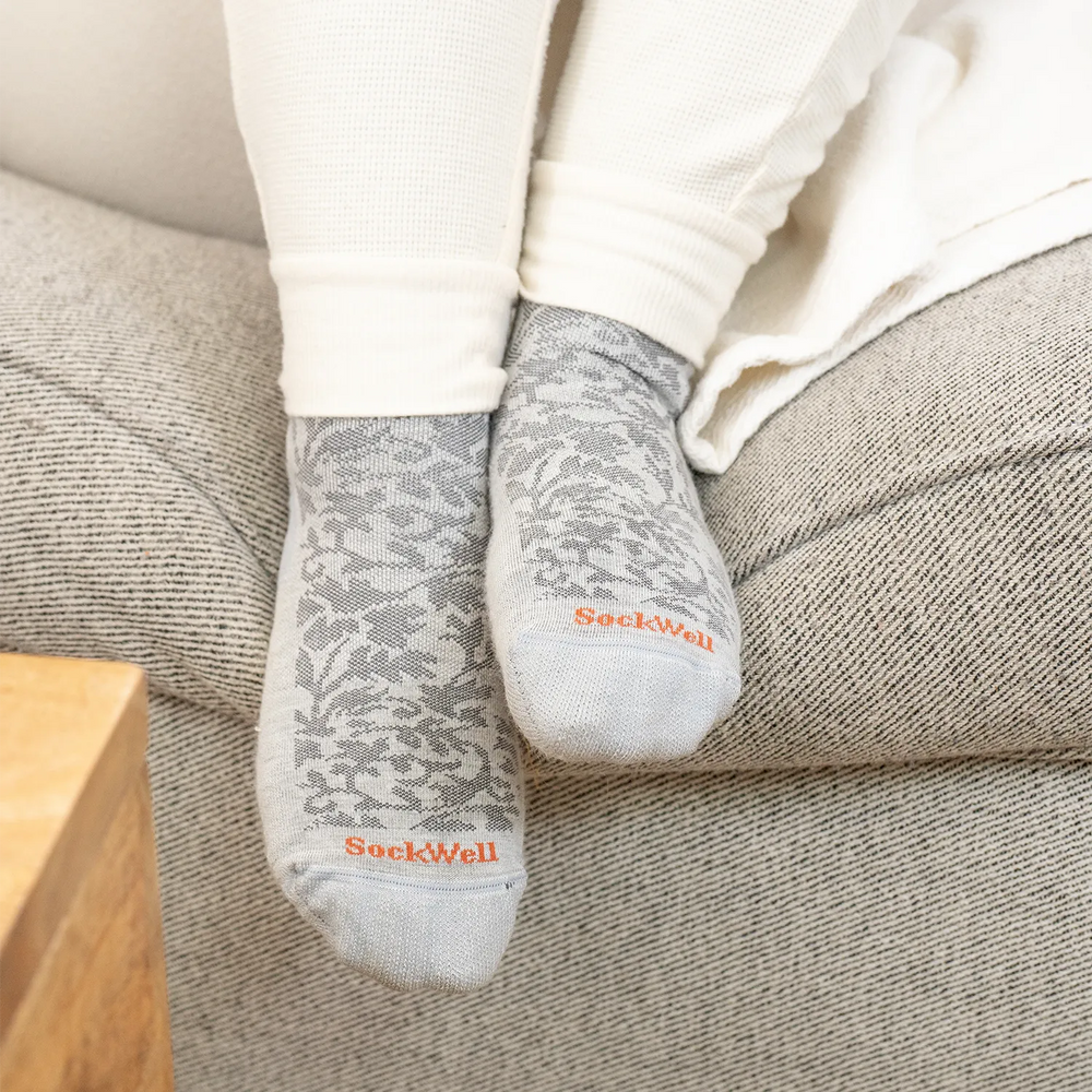 Der Sockwell Damask ist ein modischer Kompressionsstrumpf für Damen. Die Socken bieten eine leichte Kompression von 15-20 mmHg. Damit sind es Kompressionsstrümpfe für Lifestyle und Sport und bieten unterstützenden Komfort bei längerem Stehen oder Sitzen, Sport, Reisen und mehr. Sie werden oft von Menschen verwendet, die unter müden oder schweren Beinen oder Flüssigkeitsansammlung in den Füßen und Beinen leiden. Sie sind auch während der Schwangerschaft angenehm zu tragen. Der natürliche Materialmix aus Merinowolle und Bambusgarn sorgt für eine gute Feuchtigkeitsaufnahme und Temperaturregulierung.