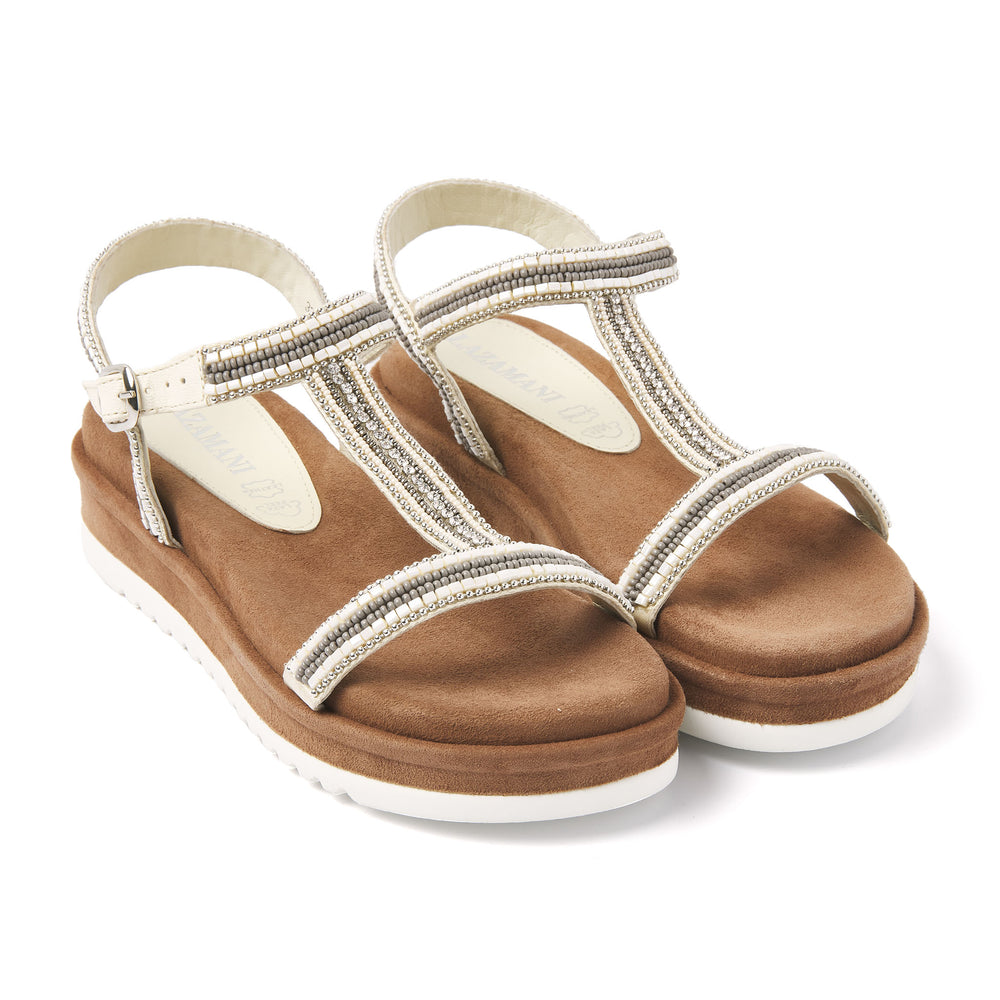 Diese Plateausandalen bieten eine perfekte Kombination von Stil, Komfort und bezahlbarer Qualität. Die Lederbänder des Oberteils sind mit verschiedenfarbigen Perlen verziert. Diese Sandalen warten geradezu darauf, für den nächsten Sommerurlaub in den Koffer gepackt zu werden! Das weich gepolsterte Fußbett ist mit atmungsaktivem Wildleder gefüttert, wodurch sich der Schuh auch an den heißesten Sommertagen noch angenehm trägt. Dank des Schnallenverschlusses lässt sich das Band auf eine optimale Passform einstellen. Die Plateausohle ist insgesamt 3,5 cm dick.
