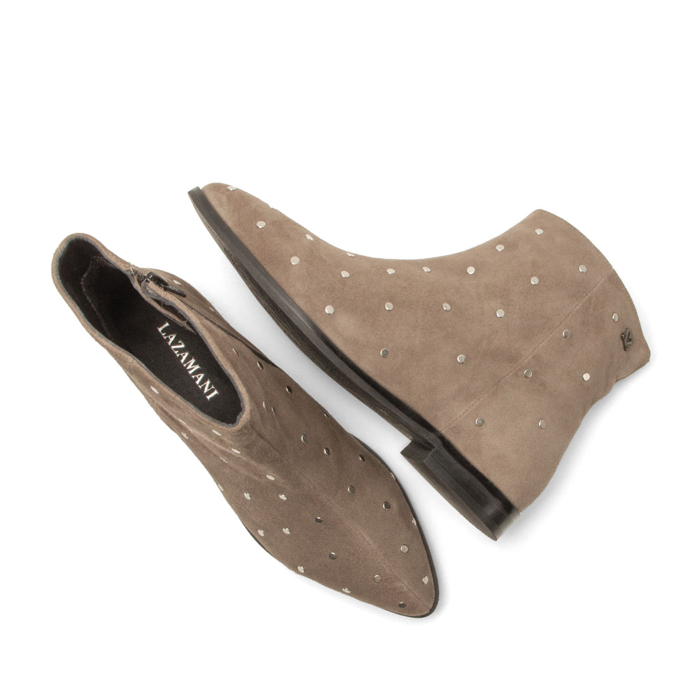 Minimalistisch mit einem edgy Twist – diese Stiefeletten von Lazamani sind echte Allrounder. Das taupe Wildleder mit subtilem Glanz bildet die perfekte Basis für die silberfarbenen Nieten im Allover-Design, die ihnen eine raffinierte, aber zugleich markante Ausstrahlung verleihen. Dank der flachen Sohle und der bequemen Passform kannst du sie den ganzen Tag mühelos tragen. Die spitze Kappe sorgt für eine feminine Note, während die Nieten genau das Quäntchen Extra-Charakter hinzufügen. Kombiniere sie lässig mit einer Straight Jeans oder setze sie als markanten Kontrast zu einem Kleid ein.