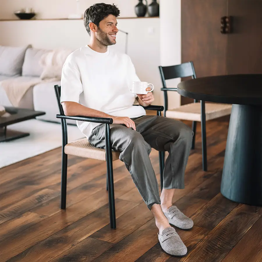 Diese Herrenhausschuhe sind aus recyceltem Filz gefertigt und mit einem Penny-Loafer-Element versehen. Sie bieten dank des praktischen Einstiegs hohen Tragekomfort im Alltag. Das fest integrierte, mit Filz bezogene Fußbett sorgt für angenehme Dämpfung, während die rutschfeste Gummisohle optimalen Halt bietet – sowohl im Haus als auch im Außenbereich.