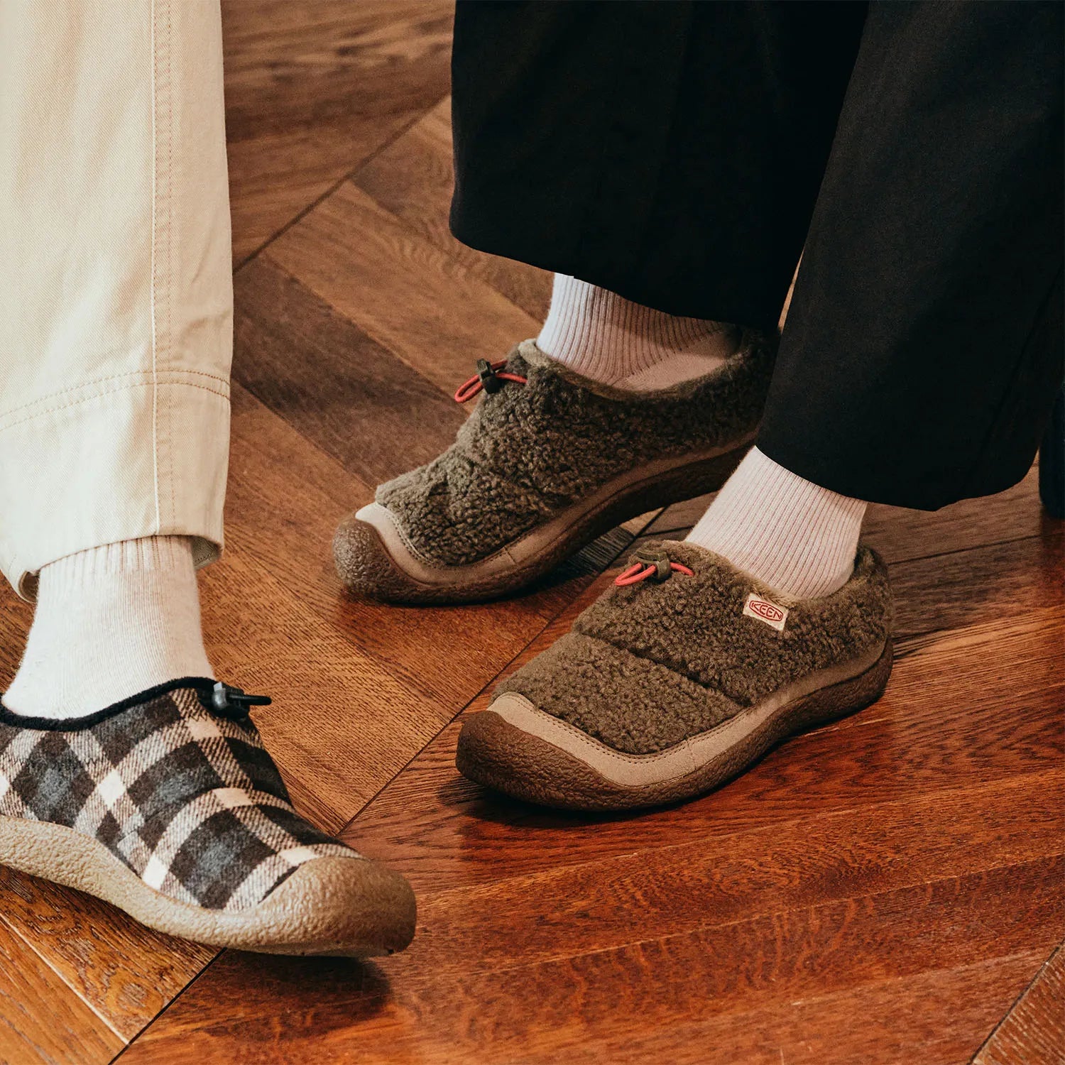 Der Howser ist der absolute Favorit unter KEEN-Fans, wenn es um bequeme Slipper geht – ideal zum schnellen Reinschlüpfen beim Camping, beim Gassigehen, beim Einkaufen oder bei allen anderen Gelegenheiten, bei denen es auf Komfort und Funktionalität ankommt. Kein Wunder, denn der Howser bietet ein unvergleichliches Tragegefühl – so gemütlich, dass er sich fast wie ein Hausschuh anfühlt. Deshalb wird er auch gerne genau dafür genutzt. Ob zu Hause, unterwegs, im Urlaub oder in der Stadt – dieser Slipper macht alles mit. Das Obermaterial in kuscheliger Teddy-Optik besteht aus recycelten PET-Flaschen und wird von einem warmen Fleecefutter ergänzt. Die flexible, langlebige Gummisohle sorgt für hervorragenden Grip auf verschiedensten Untergründen. Slip-on, stays-on: Einfach reinschlüpfen – dank Bungee-Kordel bleibt der Schuh sicher am Fuß, ganz egal, wohin du gehst.