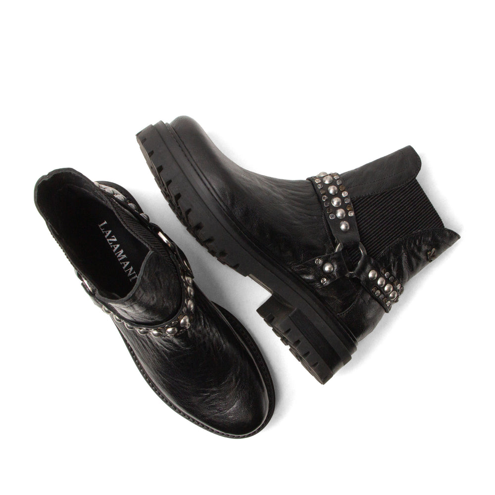 Setze auf Rock-Chic mit den Jagger Chelsea-Boots von Lazamani – sie machen jeden Look zu einem Statement. Das glänzende Glattleder in klassischem Schwarz verleiht ihnen eine luxuriöse Ausstrahlung, während der dekorative Riemen mit Nieten für einen edgy Twist sorgt. Dank der elastischen Seiteneinsätze schlüpfst du mühelos hinein und wieder heraus. Die robuste Profilsohle aus Gummi bietet Grip und Komfort für all deine Abenteuer. Kombiniere sie mit Leder-Bikerjacke und Skinny Jeans für einen starken City-Style oder trage sie zu einem fließenden Kleid für einen spannenden Stilbruch.