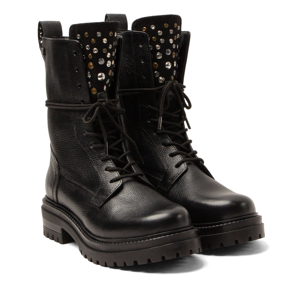 Robust mit einem Hauch Glamour. Diese schwarze Leder-Schnürstiefelette vereint markante Ausstrahlung mit subtilen, femininen Details. Die grobe Profilsohle und das hochwertige Leder sorgen für einen kraftvollen Look, während die funkelnden Nieten entlang der Zunge den typischen Lazamani-Twist verleihen. Perfekt, um jedem Outfit – von Jeans bis Kleid – das gewisse Extra zu geben. Diese hohen Schnürboots mit einer Schafthöhe von ca. 19 cm bringen Power in jeden Schritt – egal bei welchem Wetter.