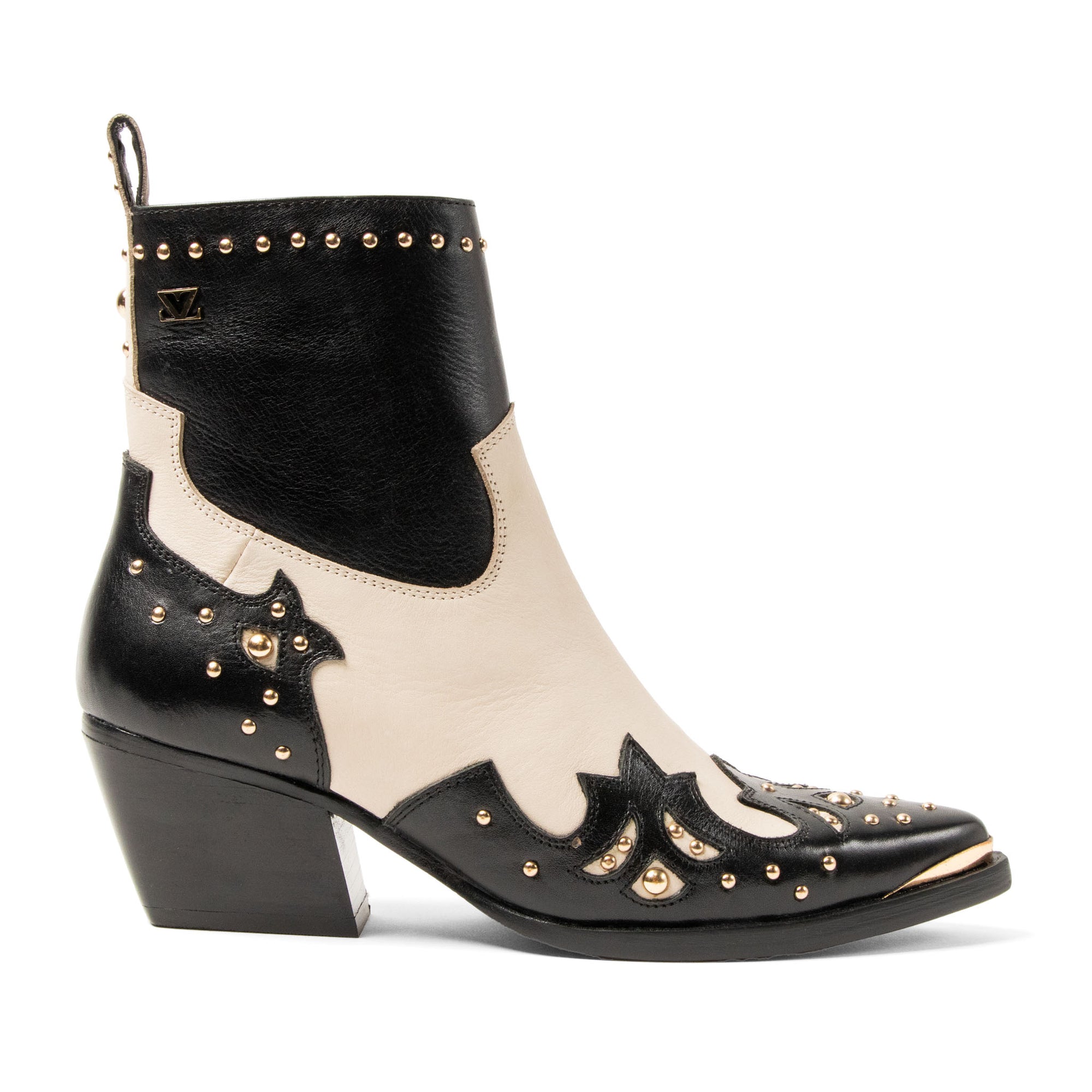 Diese trendigen Stiefeletten bestechen durch markante Western-Details und den kontrastreichen Farbmix aus Schwarz und Weiß. Dezente Nieten unterstreichen den charaktervollen Look und machen sie zu echten Hinguckern. Gefertigt aus hochwertigem, glattem Leder und mit einem seitlichen Reißverschluss ausgestattet, lassen sie sich leicht an- und ausziehen. Das weiche Textilfutter und das gepolsterte Lederfußbett sorgen für zusätzlichen Tragekomfort, während der stabile 5 cm Blockabsatz dir dezent mehr Höhe verleiht. Perfekt, um deinem Outfit das gewisse Extra zu geben – ob zu Skinny Jeans oder einem fließenden Kleid.