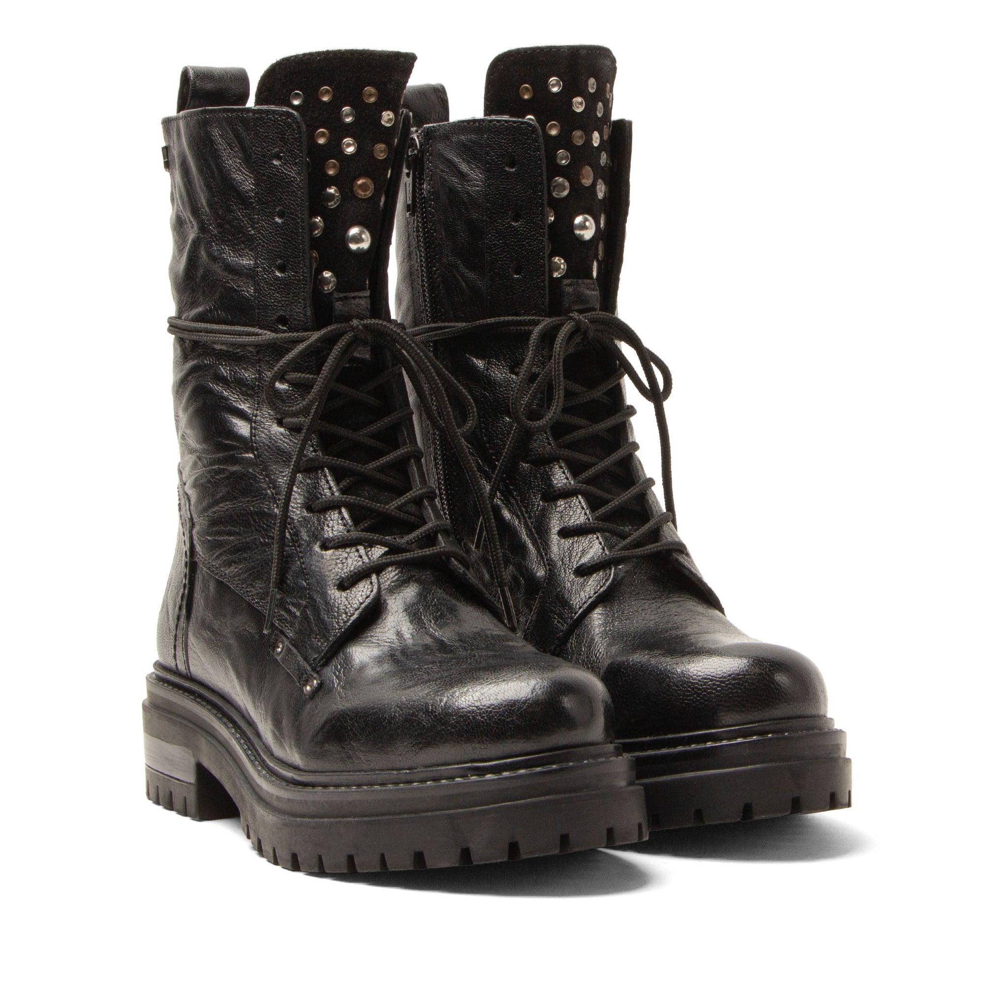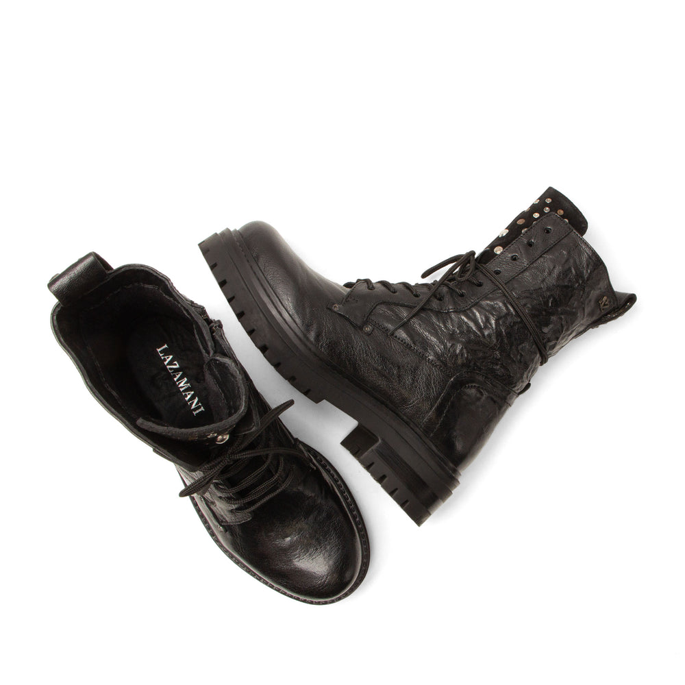 Mit ihrer Chunky-Sohle, der 10-Loch-Schnürung und dem glänzenden schwarzen Leder mit leicht geraffter Struktur sind diese Biker Boots alles andere als gewöhnlich. Nieten an der Zunge und Fersenschlaufe sorgen für den typischen Lazamani-Twist. Trotz ihres edgy Looks sind sie überraschend bequem – dank weichem Textilfutter und lederbezogenem Fußbett. Der seitliche Reißverschluss macht das Anziehen besonders unkompliziert. Ob zur Oversized-Blazer-und-Jeans-Kombi für einen City-Chic-Look oder als Kontrast zum fließenden Kleid – diese hohen Schnürboots (Schafthöhe ca. 19 cm) verleihen jedem Schritt Power – bei jedem Wetter.