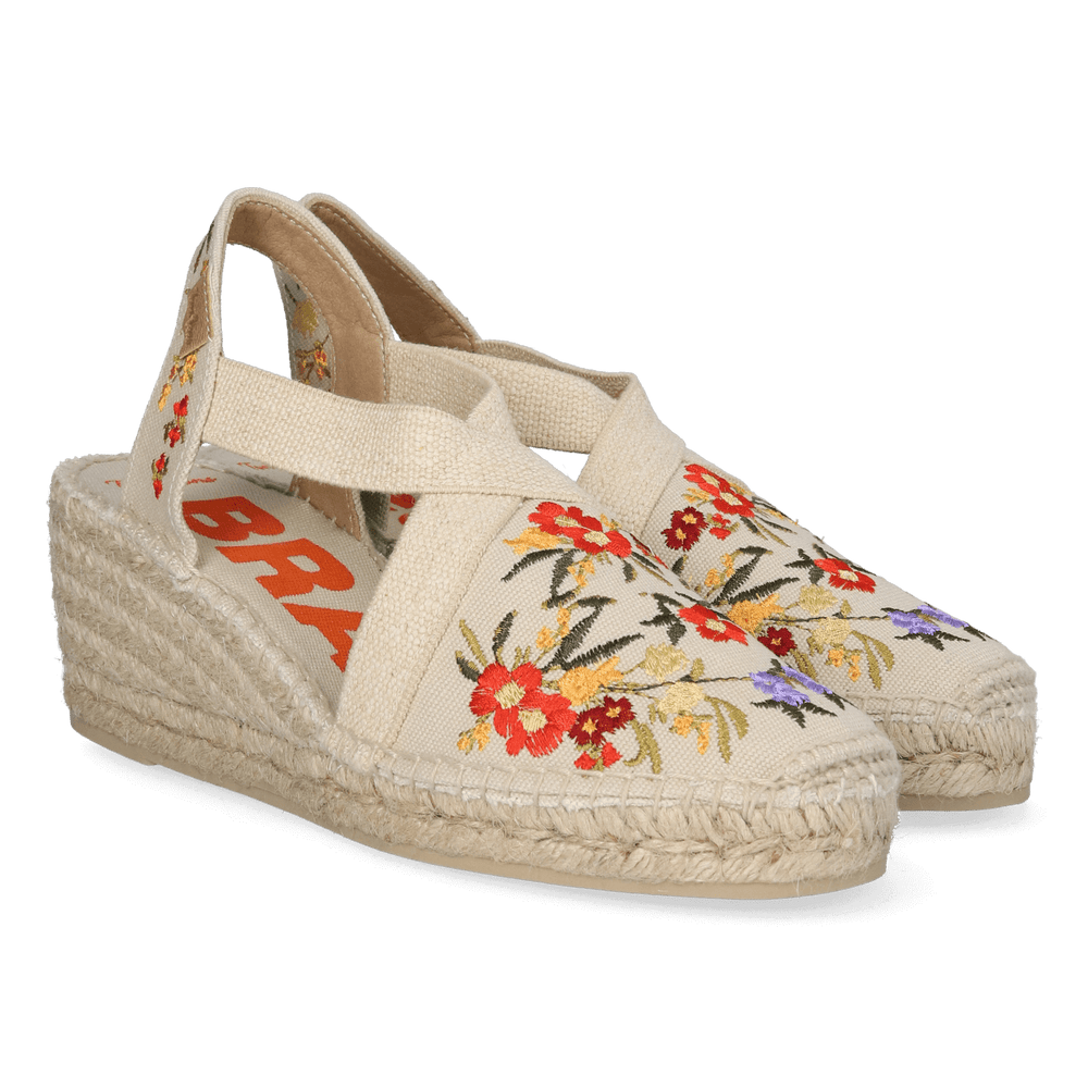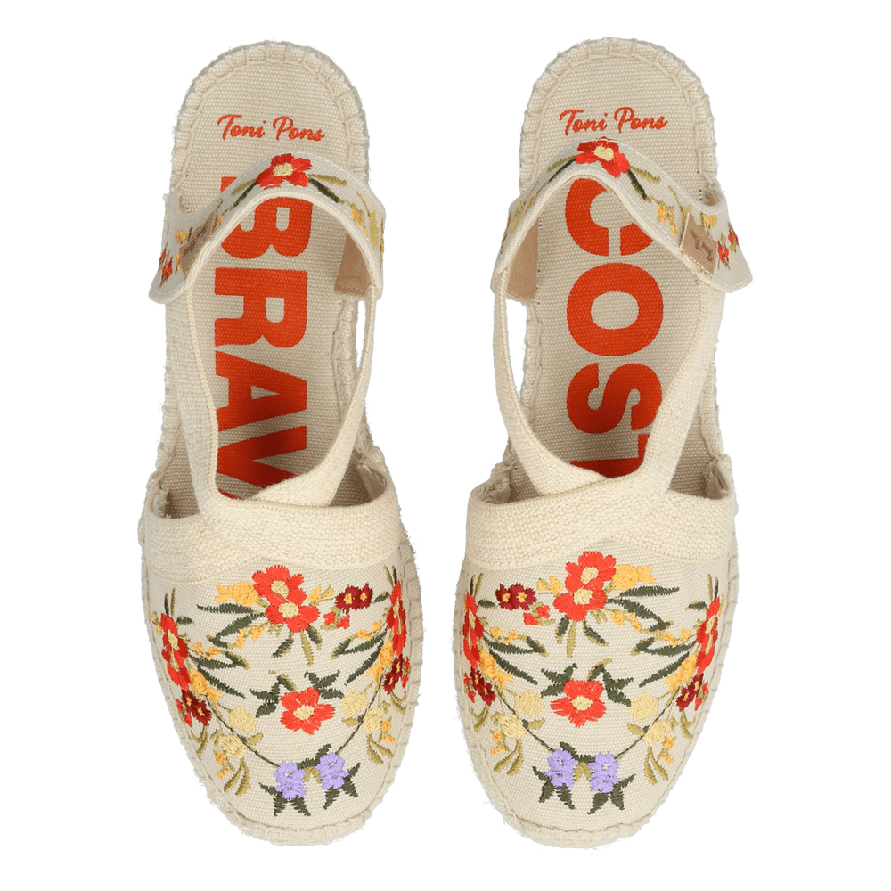 Diese Montjoi-Espadrilles aus der Costa Brava Kollektion von Toni Pons sind eine Hommage an die Heimatregion der Marke. Die farbenfrohen Espadrilles mit Keilabsatz versprühen pure Sommerlaune und sind die perfekte Ergänzung zu deinen liebsten Sommeroutfits. Das Obermaterial aus Baumwolle ist mit einem wunderschönen, bunten Blumenmuster bestickt. Der Keilabsatz hat eine Höhe von 4,5 cm, ergänzt durch ein Plateau von 1,5 cm – für eine Gesamthöhe von 6 cm. Dank des festen, elastischen Bands zwischen Vorder- und Fersenriemen sitzt der Schuh sicher und bequem am Fuß.