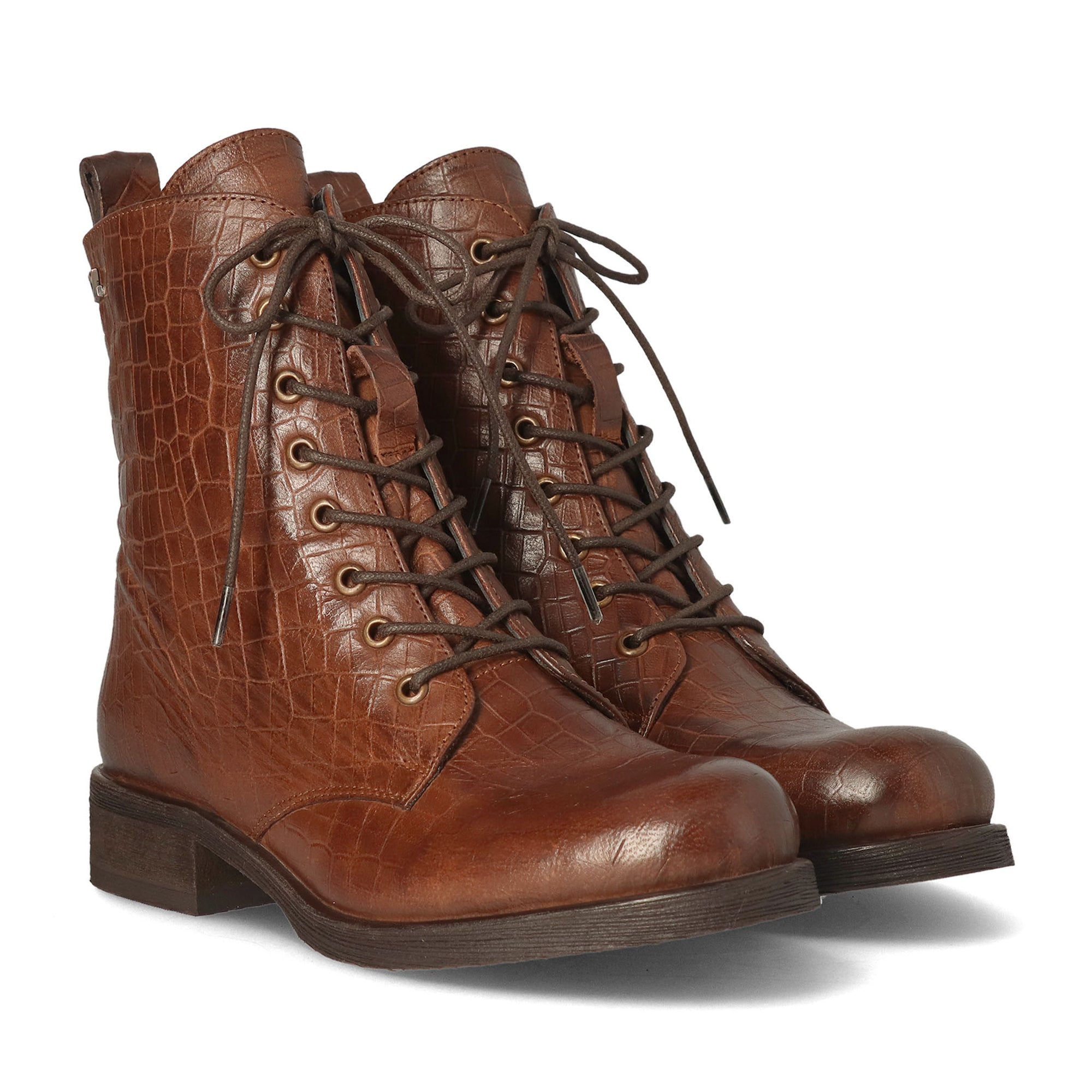 Schnürstiefeletten aus Leder mit Krokoprägung