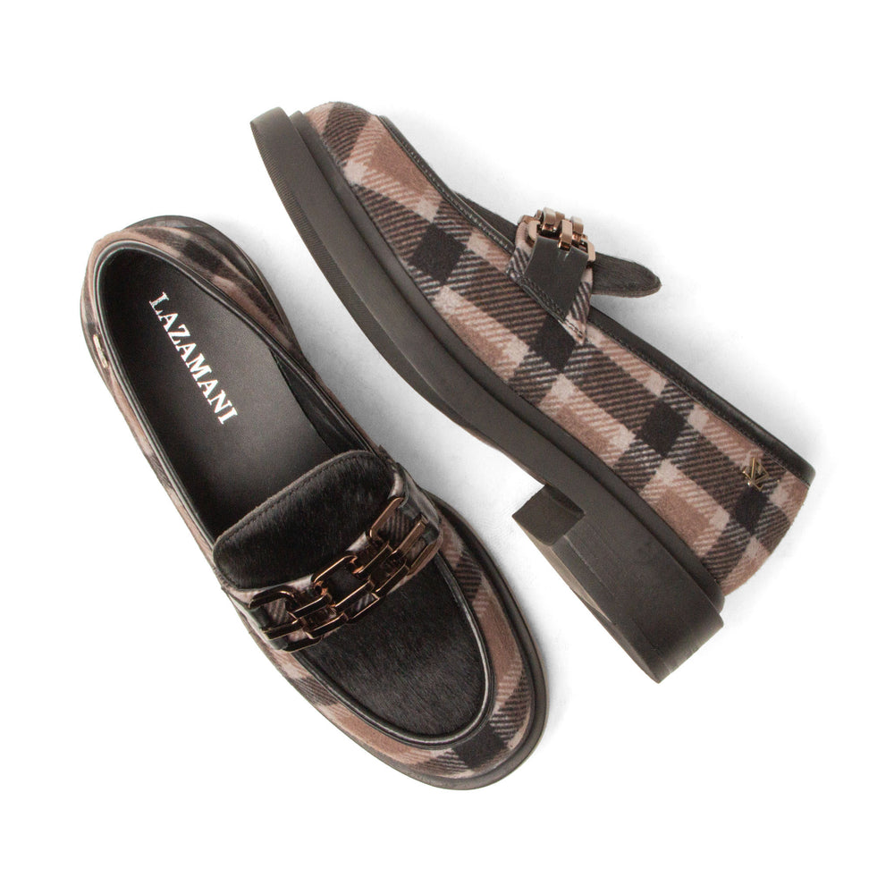 Check, please! Diese Loafer sind echte Hingucker – gefertigt aus weichem Tartan-Stoff in warmen Farbtönen und veredelt mit Ponyhaar und einer markanten Kette auf dem Spann. Die Kombination aus klassischem Karomuster, robuster Sohle und metallischen Details verleiht diesem Modell einen modernen Twist – typisch Lazamani. Perfekt für alle, die den stilvollen College-Look lieben. Trage sie zu einer Cropped Jeans oder kombiniere sie mit einem Wollrock für einen herbstlichen Look mit Charakter.