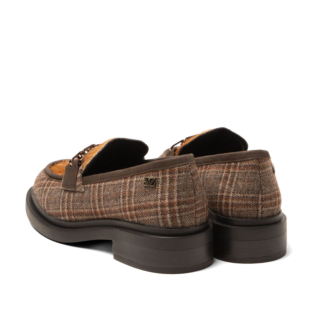 Check, please! Diese Loafer sind echte Hingucker – gefertigt aus weichem Tartan-Stoff in warmen Farbtönen und veredelt mit Ponyhaar und einer markanten Kette auf dem Spann. Die Kombination aus klassischem Karomuster, robuster Sohle und metallischen Details verleiht diesem Modell einen modernen Twist – typisch Lazamani. Perfekt für alle, die den stilvollen College-Look lieben. Trage sie zu einer Cropped Jeans oder kombiniere sie mit einem Wollrock für einen herbstlichen Look mit Charakter.