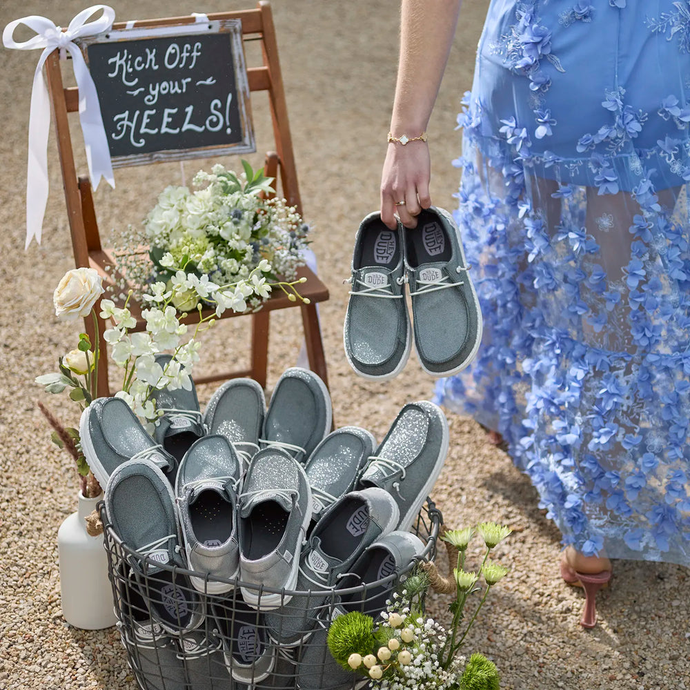 Diese Variante des Wendy Low-Top-Mokassins verleiht Ihrem Outfit etwas zusätzlichen Glitzer und Glamour. Der Halbschuhe ist mit einem textilen Obermaterial mit einem Glitzer-Touch ausgestattet. Zudem bietet der Slipper alles, was man von einem HEYDUDE-Damen-Icon erwarten darf; ein einfaches Hineinschlüpfen, ein ultraleichtes Gewicht und das natürlichste Tragegefühl, das sich fast wie barfuß anfühlt. Das austauschbare Memory-Schaum-Fußbett dämpft jeden Schritt, während die EVA-Laufsohle die ersten Stöße absorbiert und den notwendigen Grip bietet.
