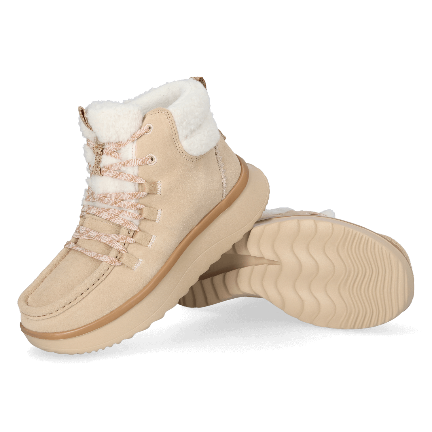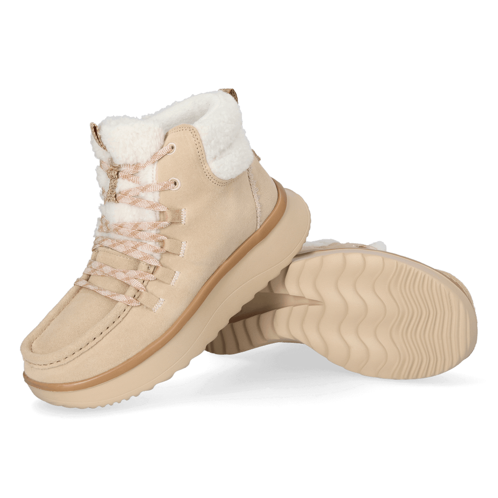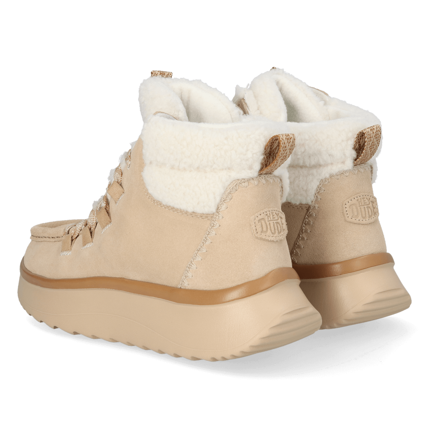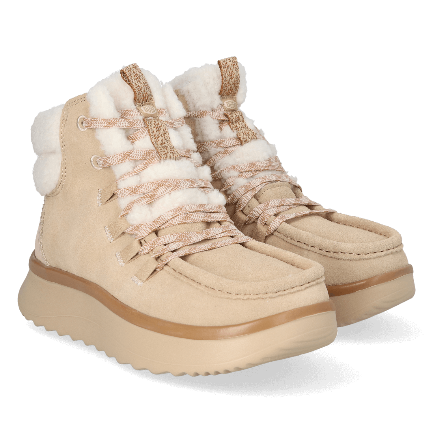 Ein Grund, sich auf kalte Tage zu freuen: Diese Winterboots bringen das Easy-On-Gefühl des Wendy-Slippers in eine winterfeste Variante. Etwas höher geschnitten, mit Wildleder-Obermaterial und kuscheligem Sherpa-Futter an Schaft und Zunge – und dabei so leicht, dass du fast vergisst, dass du sie trägst. Dank elastischer Schnürung und Schlaufen einfach reinschlüpfen, auf das herausnehmbare Schaumfußbett treten – und loslaufen. Weich, warm und super entspannt – typisch HEYDUDE.
