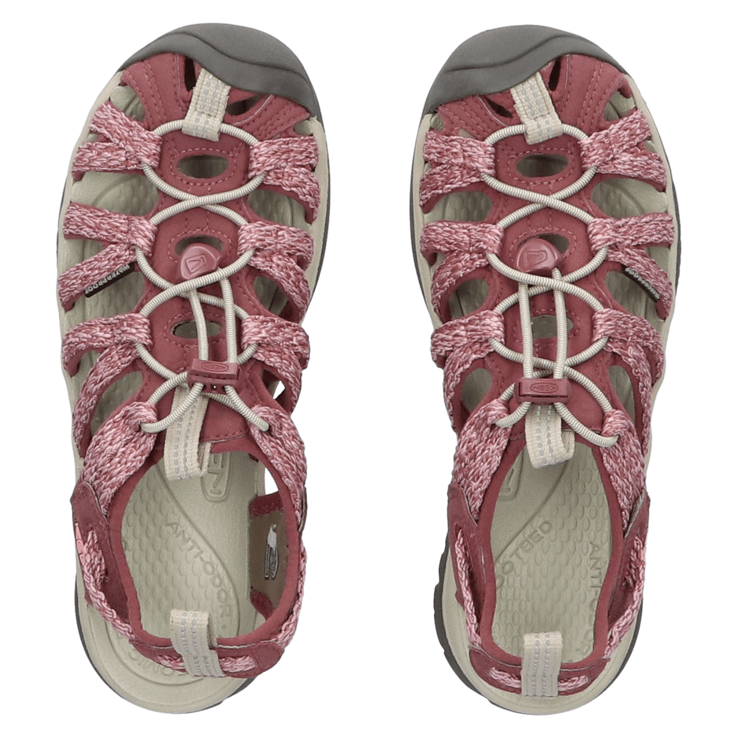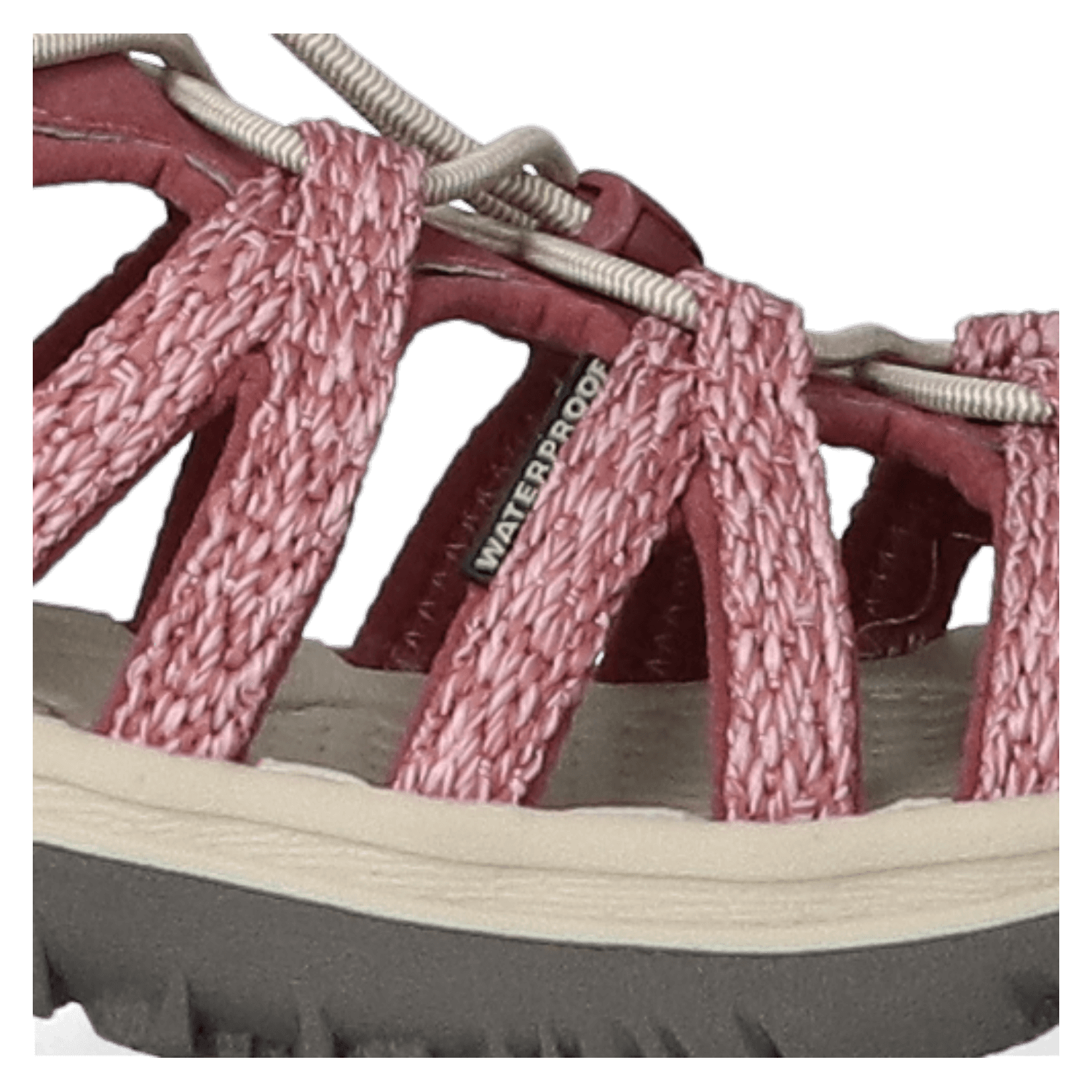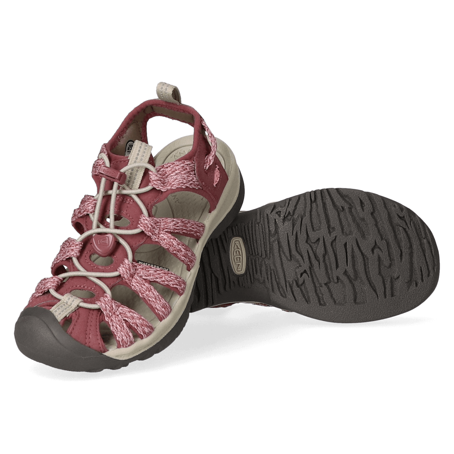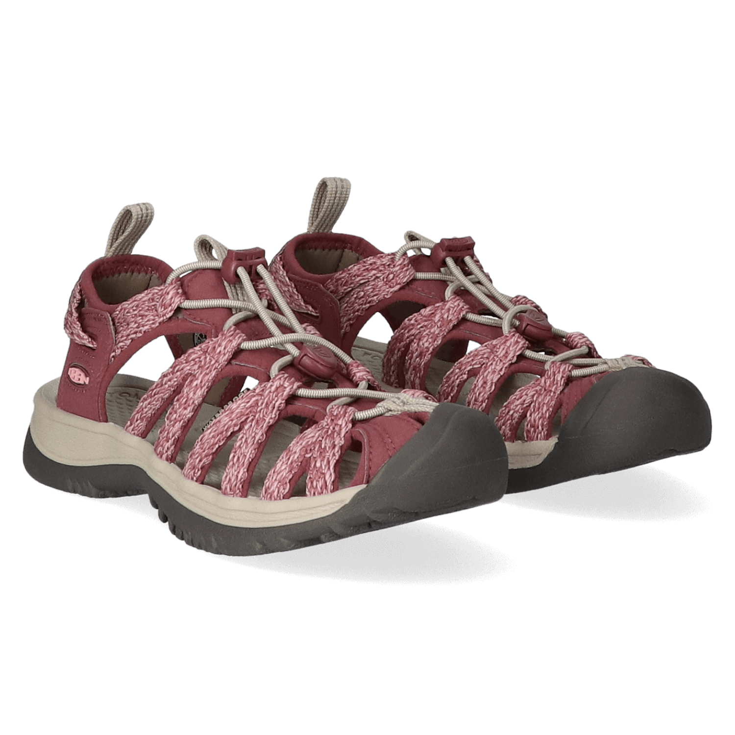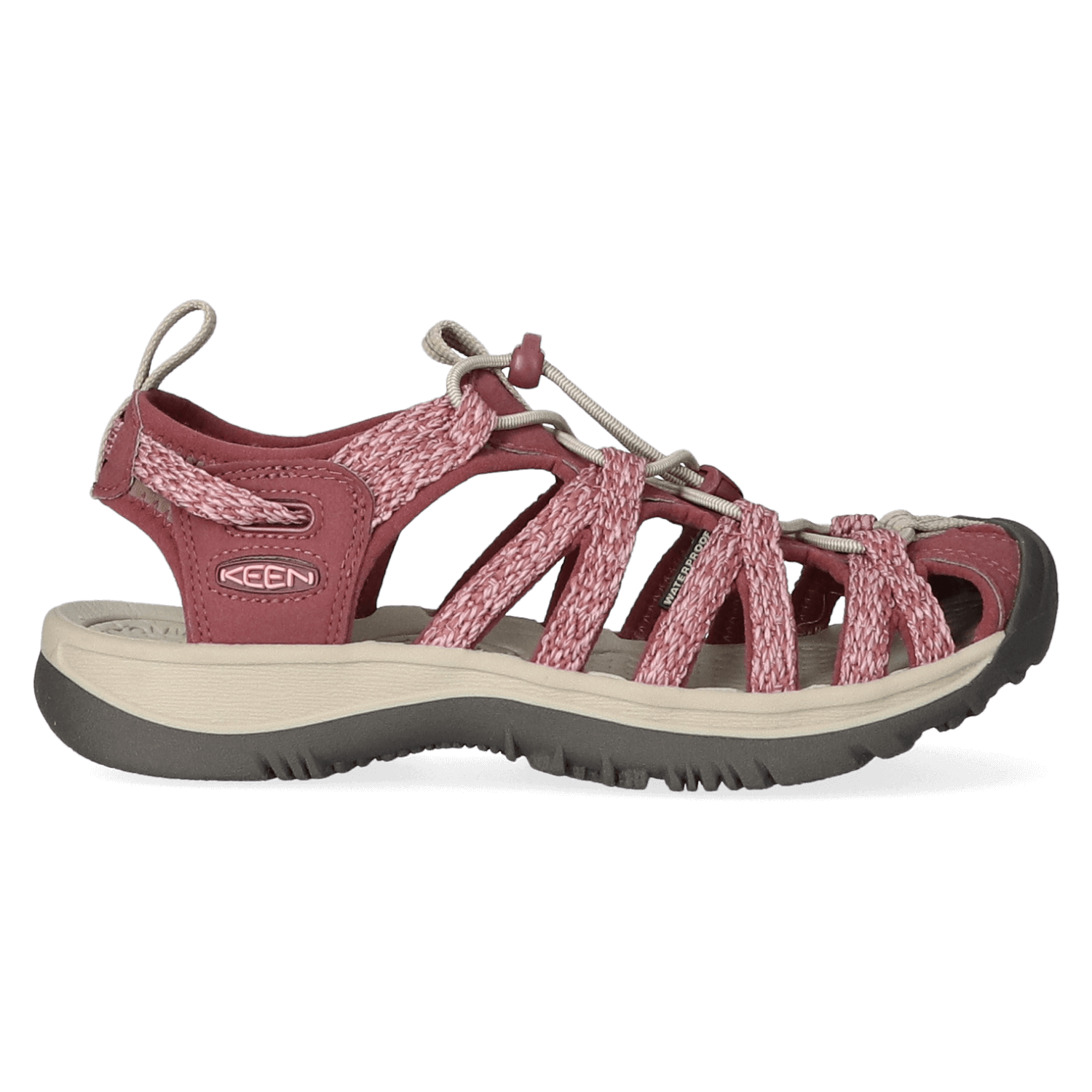 Ein elastischer Kordelzug verleiht diesen leichten Wandersandalen einen guten Halt und eine Passform, die sich einfach an den Fuß anpassen lässt. Ein tropischer Regenschauer oder ein staubiger Pfad, kein Problem für KEEN Sandalen. Diese Whisper mit Obermaterial aus Polyester sind wasserfest und können daher sicher mit Wasser gereinigt werden. Das gepolsterte Foam-Fußbett ist anatomisch geformt und sorgt für Komfort unterwegs, während die profilierte Gummilaufsohle optimalen Grip auf ganz unterschiedlichen Untergründen bietet. Die Zehen werden durch die Zehenkappe aus Gummi vor Stößen geschützt.