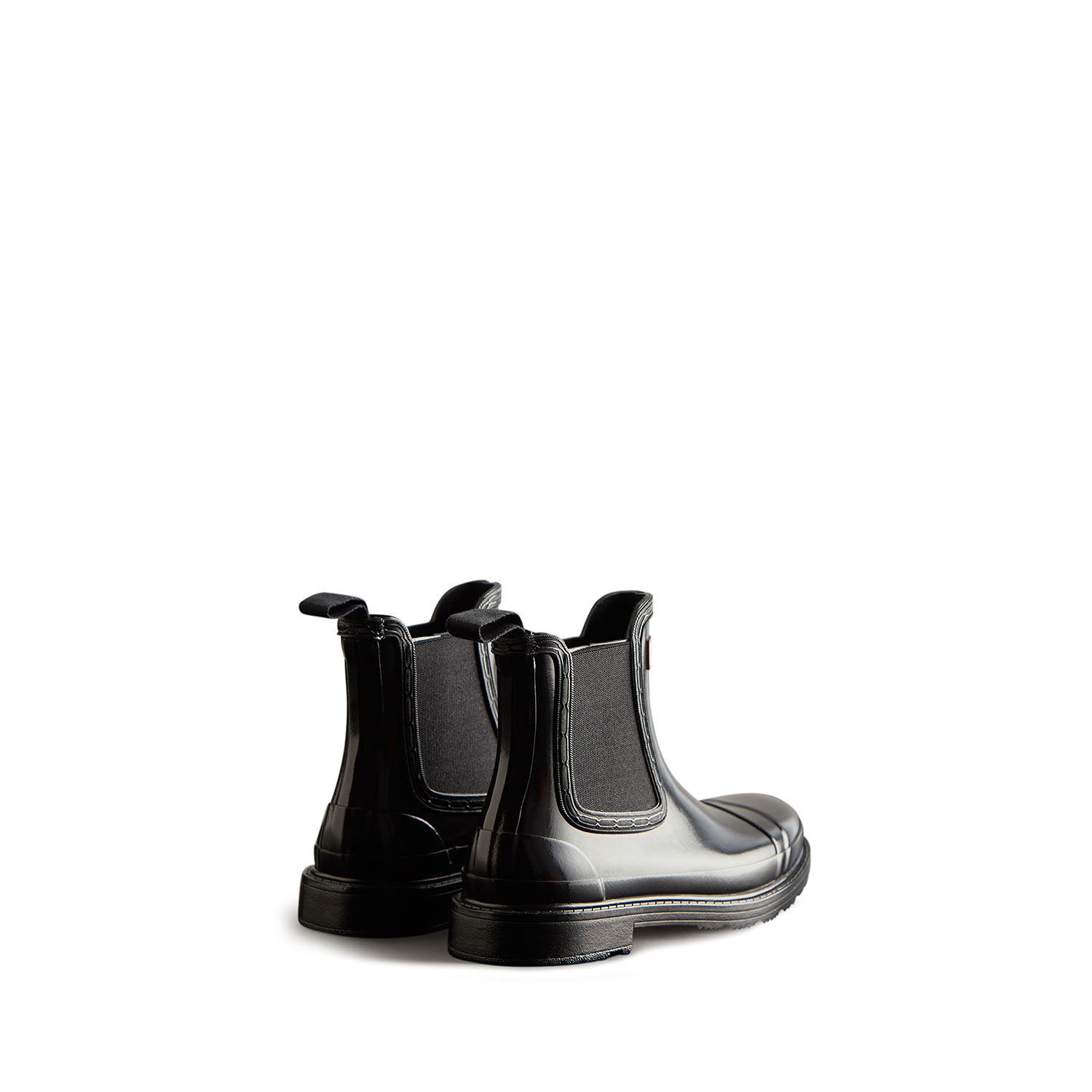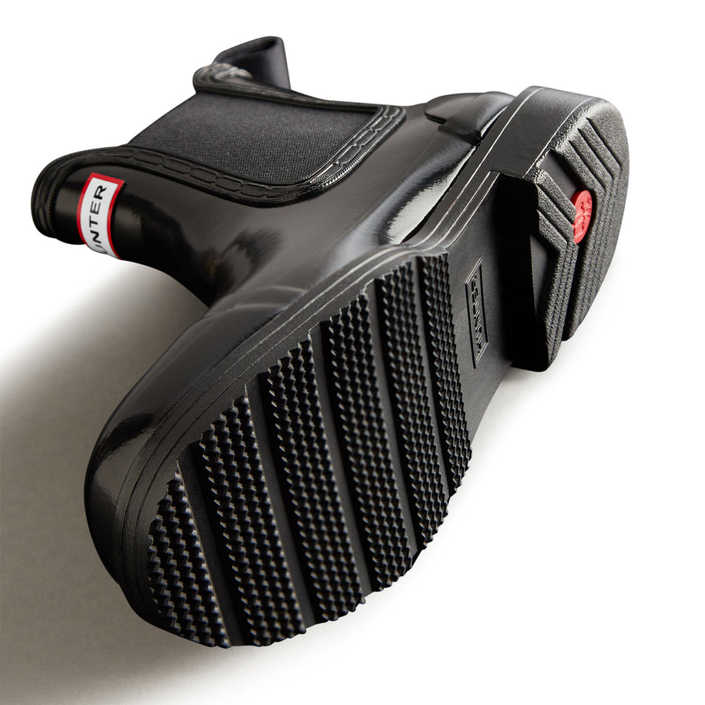 Die Women's Commando Chelsea Gloss Boots von Hunter sind wasserabweisende Damenstiefeletten aus FSC®-zertifiziertem Naturkautschuk. Das bedeutet, dass sie nach den strengsten Standards gefertigt wurden, um Wälder sowie die Tiere und Gemeinschaften, die davon abhängig sind, zu schützen. Das Modell basiert auf den originalen Chelsea Boots der Marke, wurde jedoch bei dieser Commando-Version um eine 15 mm höhere Schafthöhe und ein Futter aus recyceltem Polyester ergänzt. Die Hochglanz-Oberfläche macht sie zu einem unverzichtbaren, modischen Begleiter bei wechselhaftem Wetter. Dank der elastischen Einsätze lassen sich die Boots leicht anziehen. Sie haben eine schmale Passform, fallen jedoch größengetreu aus. Liegt man zwischen zwei Größen oder möchte man dicke Socken tragen, empfiehlt sich die größere Größe.
